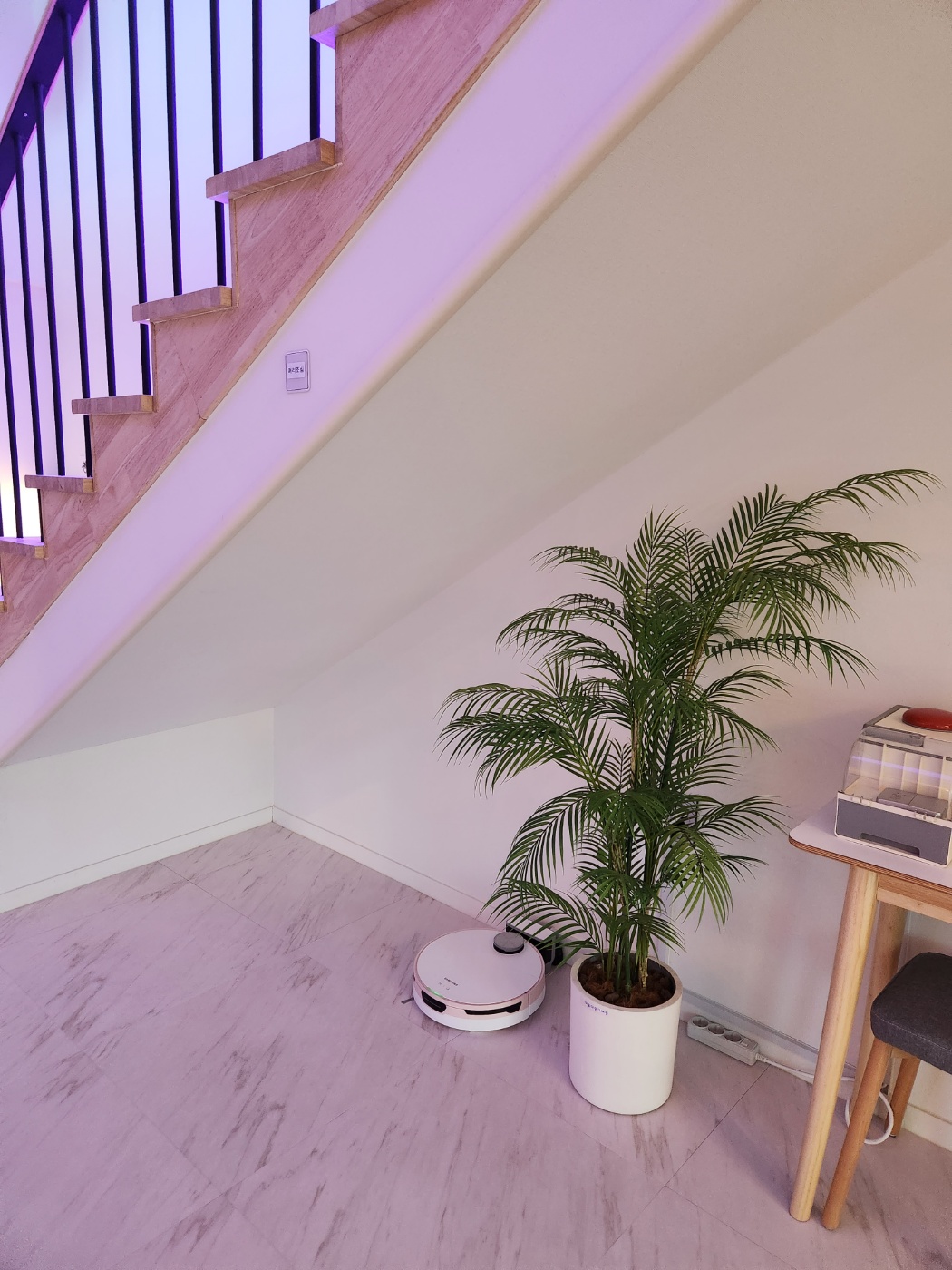 신축의 복층 가정집을 연상케하는 화이트톤의 깔끔한 인테리어. 현관에 가지런히 정돈되어 있는 실내화들부터 이미 성공적인 느낌이었다