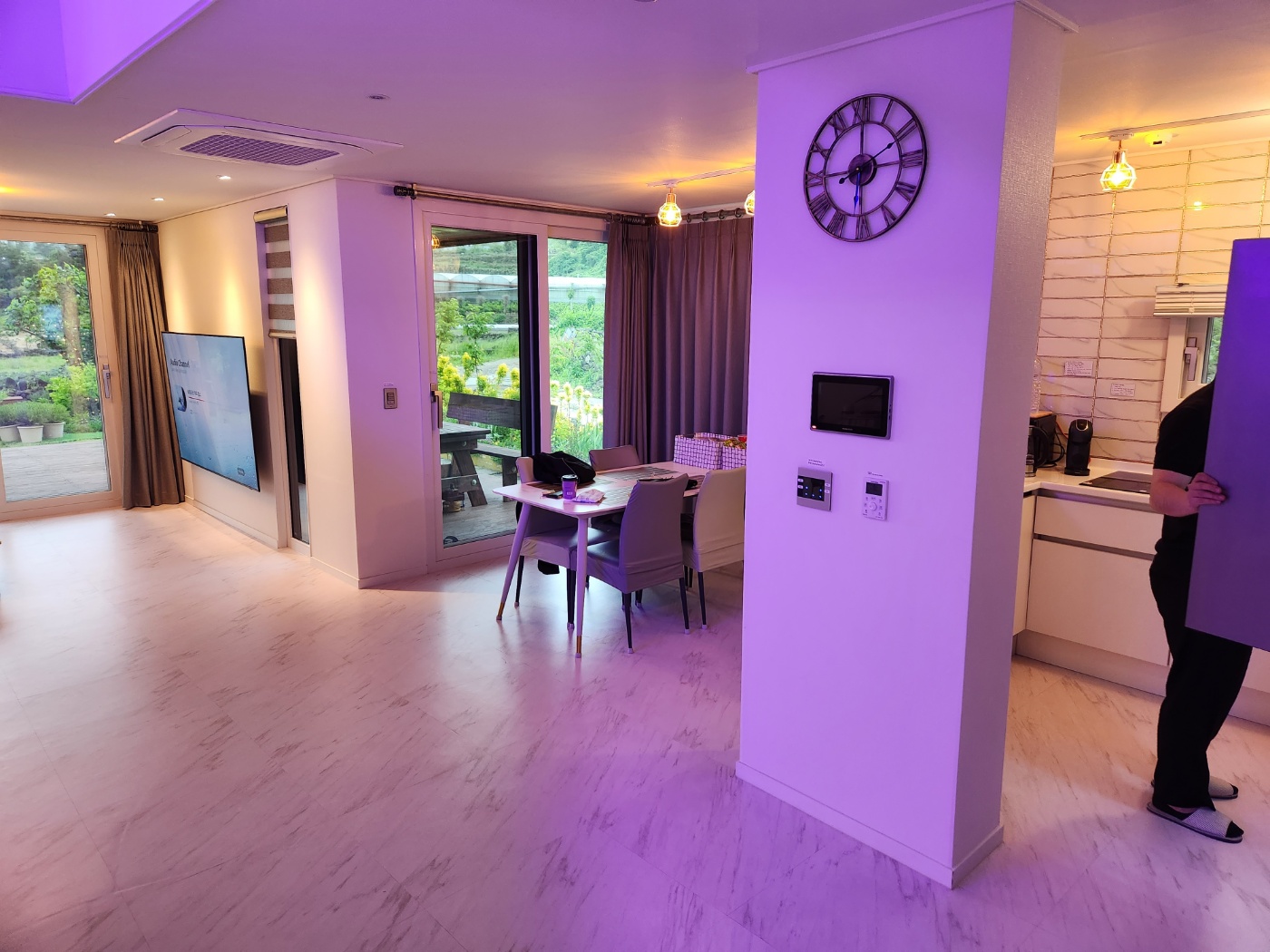 아까도 말했지만 제주몽글랑 펜션은 이제 막 결혼한 신혼부부가 살고 있는 신축 가정집을 연상케 한다 로봇청소기, 스타일러, 식기세척기, 건조기까지 완비되어 있기 때문이다