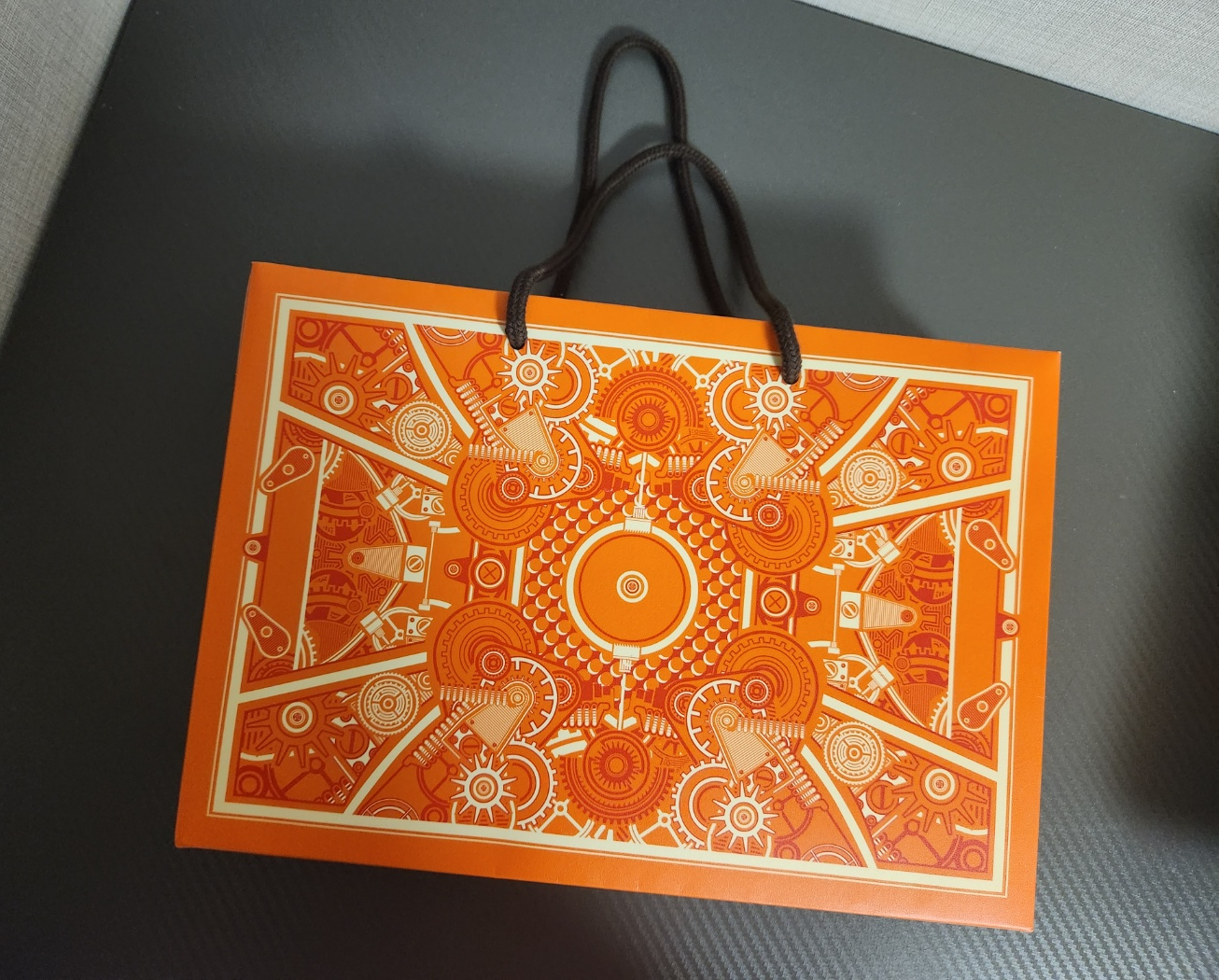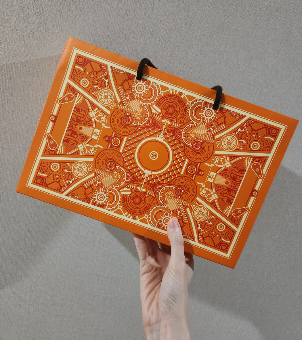 에르메스 시그니처답게 오렌지 컬러의 화려한 문양이 특징인 쇼핑백.