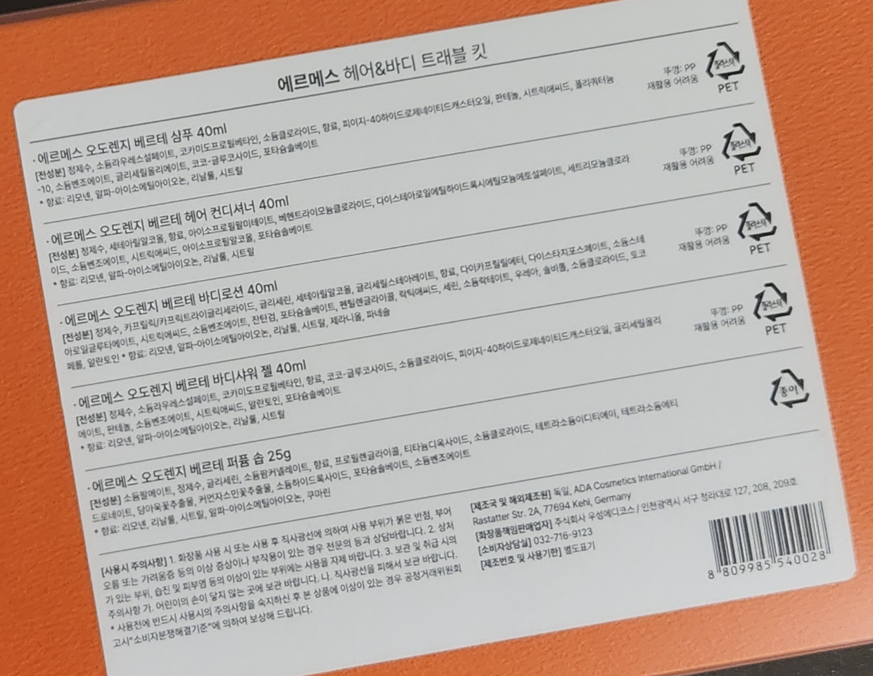 에르메스 헤어&바디 트래블킷 역시 오도렌지 향을 베이스로 만들어졌기 때문에 샤워하고 나왔을 때 튀는 향 하나 없이 머리부터 발끝까지 하나의 에르메스향으로 기분낼 수 있다.